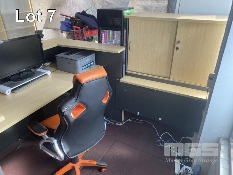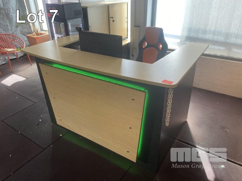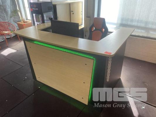 RECEPTION COUNTER, TIMBER LAMINATE, 1800 x 1200mm, BEECH STORM FINISH WITH CASH DRAWER, WITH 2 DOOR CREDENZA, 1200 x 450 x 230mm, GAS LIFT OFFICE CHAIR, SIDE TABLE & 3 DRAWER UNDER DESK MOBILE
