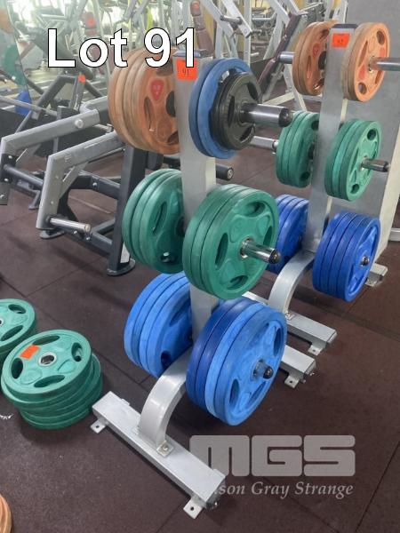 PLATE RACK WITH 22 x KUVET PLATES, 2 x 1.25kg, 2 x 2.5kg, 4 x 5kg, 6 x 10kg, 8 x 20kg