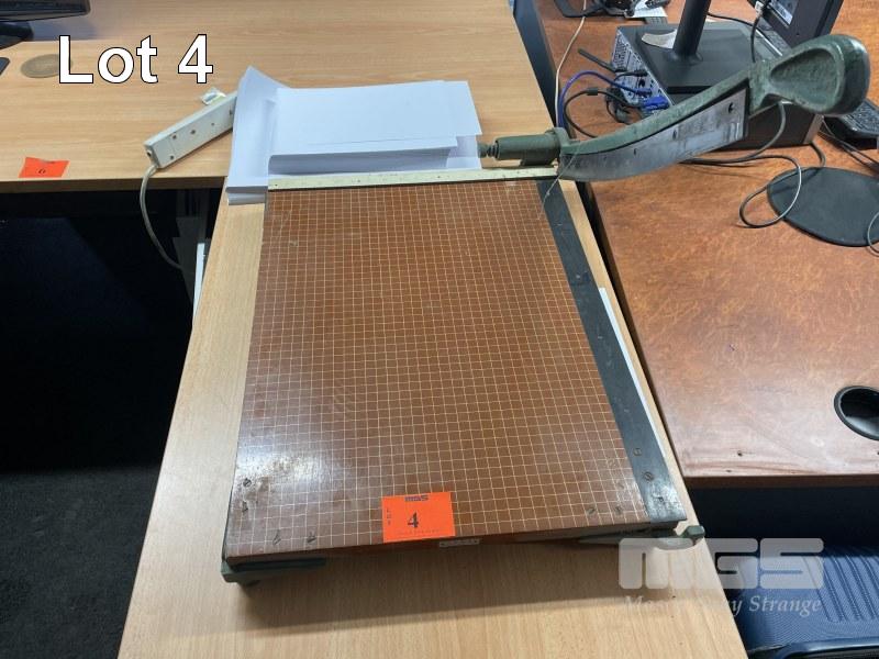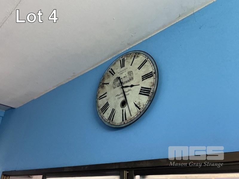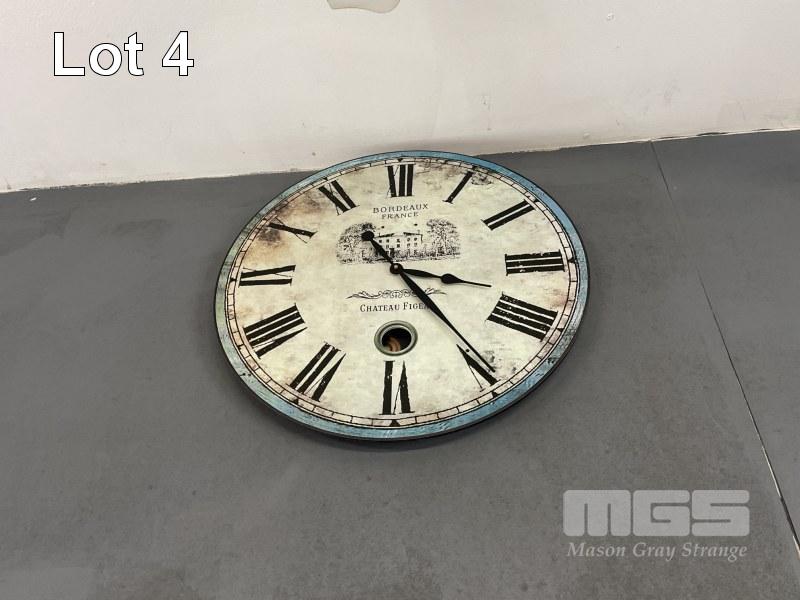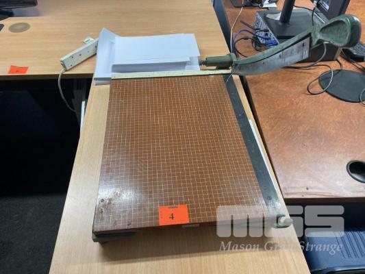 ANTIQUE PRINTERS GUILLOTINE, 24 x 18" & 3 x CLASSIC LOOK WALL CLOCKS