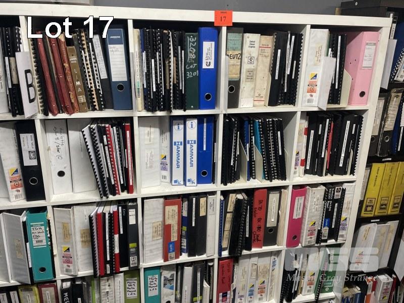 ASSORTED MACHINE MANUALS INC KATO, MERLO, KOBELCO, DETROIT, DEUTZ IN 25 HOLE PIGEON HOLE UNIT