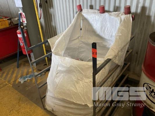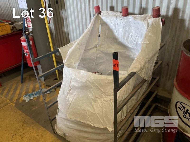 STEEL RAG BIN & RAGS WITH CUT OUT DRUM, WHEEL & PLASTIC REEL ON WALL