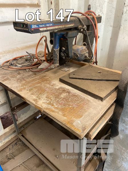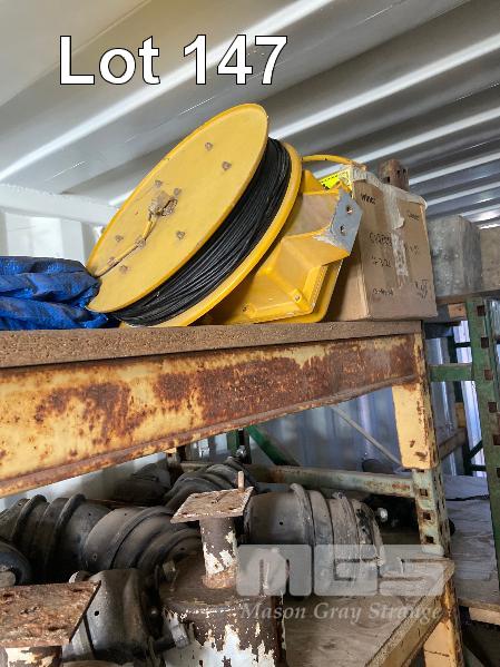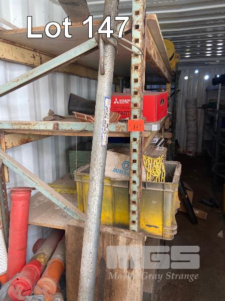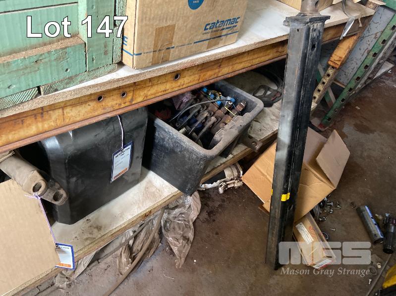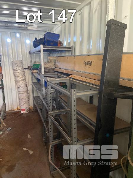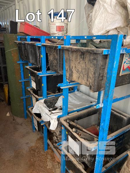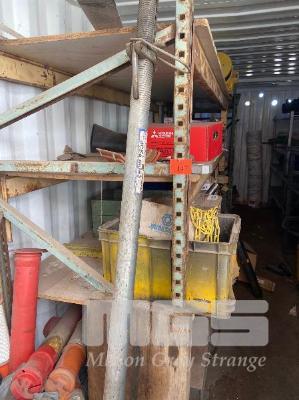 CONTENTS OF 40FT CONTAINER, ACRO PROP, 16 TUB STORAGE RACK WITH 10 x PVC TUBS, VARIOUS HYDRAULIC PARTS, RAMS, RETRACTABLE REEL, ARC WELDER, TOOL BOX, LARGE WELDER, RYOBI RADIAL ARM SAW, 2 x SACK TRUCKS ETC.