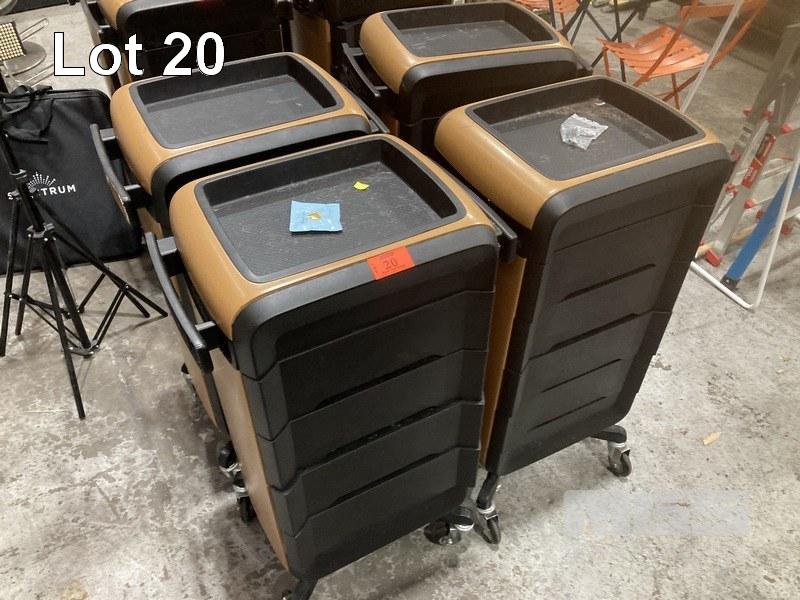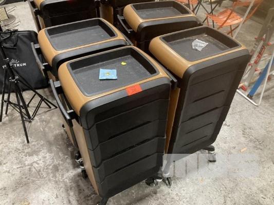 4 x SALON TROLLEYS, COMFORTEL, MOVA WITH 4 OUTLET POWERBOARD & 4 USB PORTS