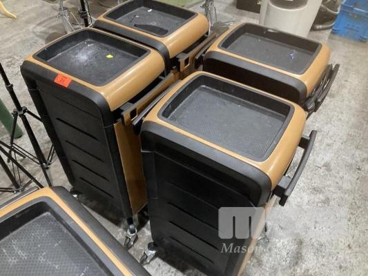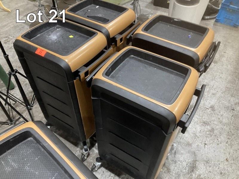 4 x SALON TROLLEYS, COMFORTEL, MOVA WITH 4 OUTLET POWERBOARD & 4 USB PORTS