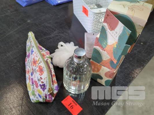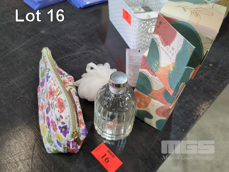 ASSORTED PEPPERMINT GROVE AUSTRALIA PRODUCTS 1 X BEAUTY BAG. 1 X DIFFUSER BOTTLE 350 ML. 1 X PATCHOULI & BERGAMOT HAND CREAM 75ML. 3 X LUSCIOUS LYCHEE & PEONY SOY CANDLES IN GIFT CARD PACK, 60 G. 1 X BATH LOOFAH