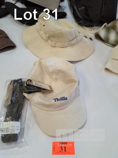 ASSORTED THRILLS ACCESSORIES 1 X DELL STRIPE WIDE BRIM HAT 1 X NEVER FORGOTTEN 6-PANEL CAP 1 X MILITARY BELT 1 X MILITARY CLIP KEYRING