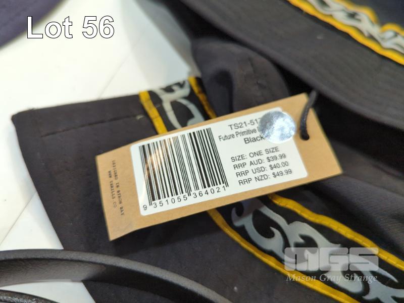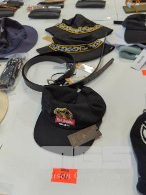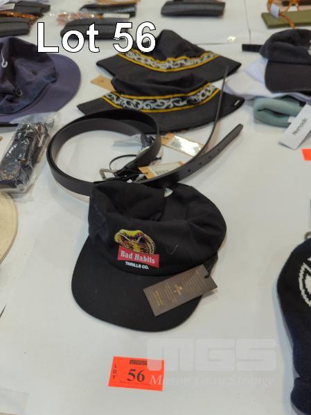 ASSORTED THRILLS ACCESSORIES 2 X FUTURE PRIMITIVE BUCKET HATS. 1 X KING HABITS 5-PANEL CAP 2 X WOMEN'S LEATHER BELTS. SIZE SMALL- MEDIUM.