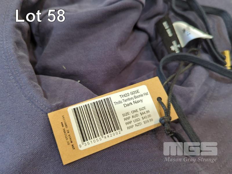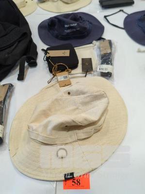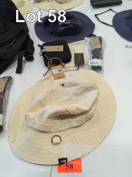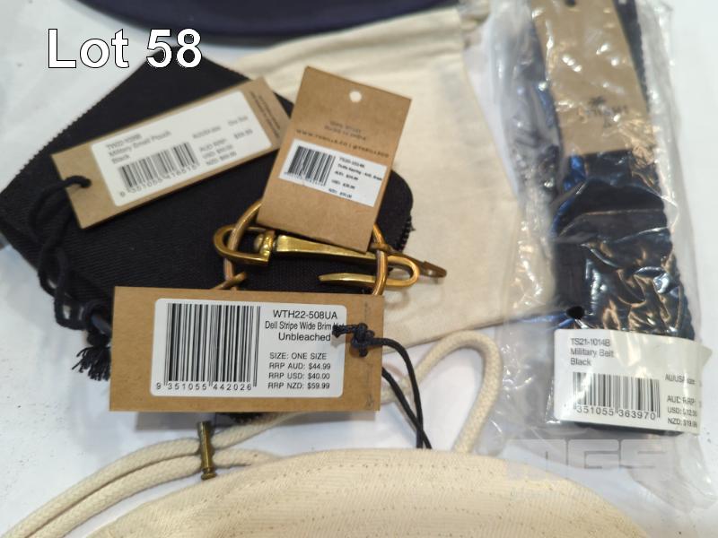 ASSORTED THRILLS ACCESSORIES 1 X DELL STRIPE WIDE BRIM HAT 1 X TERRITORY BOONIE HAT 1 X MILITARY BELT 1 X BRASS KEYRING 1 X MILITARY SMALL POUCH WALLET