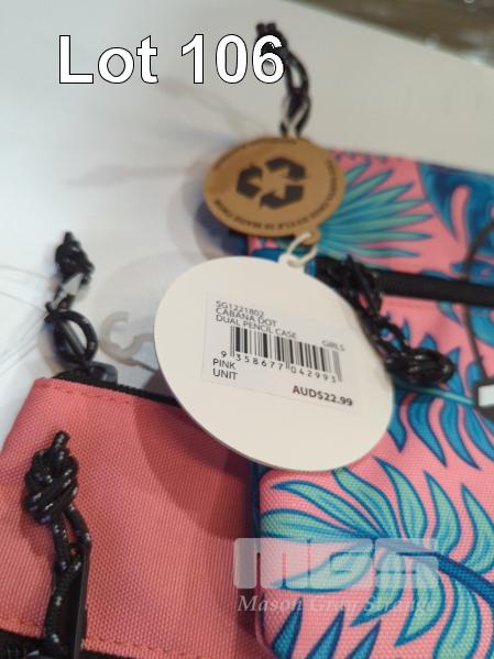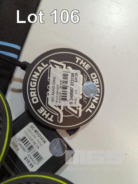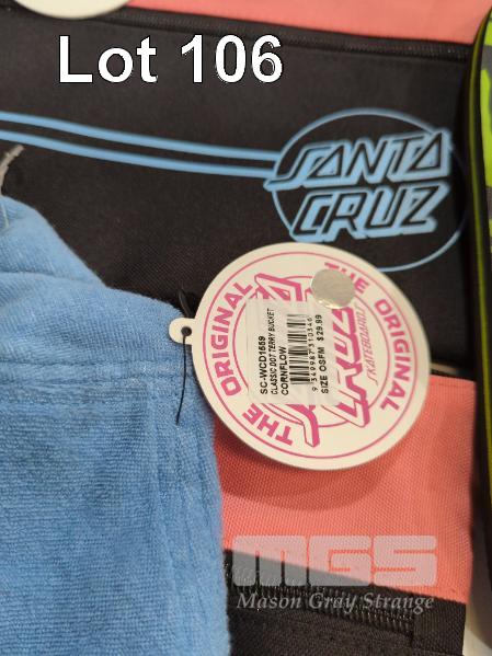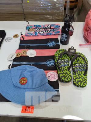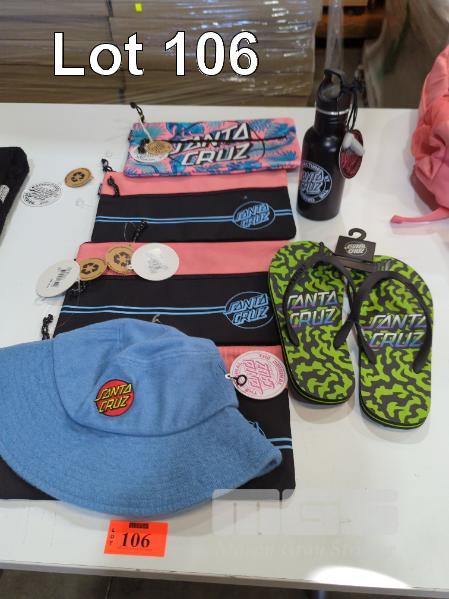 ASSORTED SANTA CRUZ GEAR 1 X SANTA CRUZ MFG DOT DRINK BOTTLE 3 X SANTA CRUZ OPUS DOT STRIPE DUAL PENCIL CASES 1 X SANTA CRUZ CABANA DOT STRIPE DUAL PENCIL CASE 1 X SANTA CRUZ CLASSIC DOT TERRY BUCKET HAT 1 X PAIR SANTA CRUZ THONGS - OBSCURE NEON. SIZE 9.
