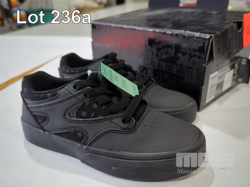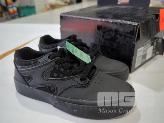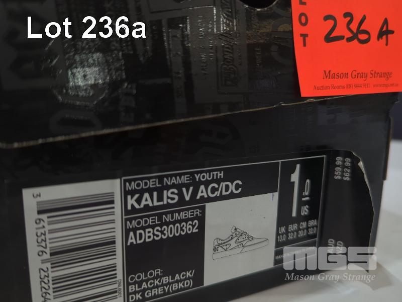 1 X PAIR DC SHOES YOUTH "KALIS V AC/DC" SHOES. SIZE 1. COLOUR: BLACK/BLACK/DK GREY.
