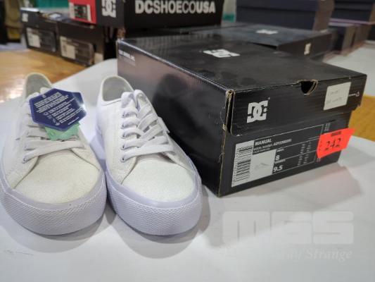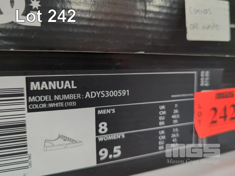 1 X PAIR DC SHOES "MANUAL" SHOES. MEN'S SIZE 8, WOMEN'S SIZE 9.5. COLOUR: WHITE.