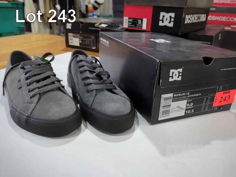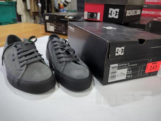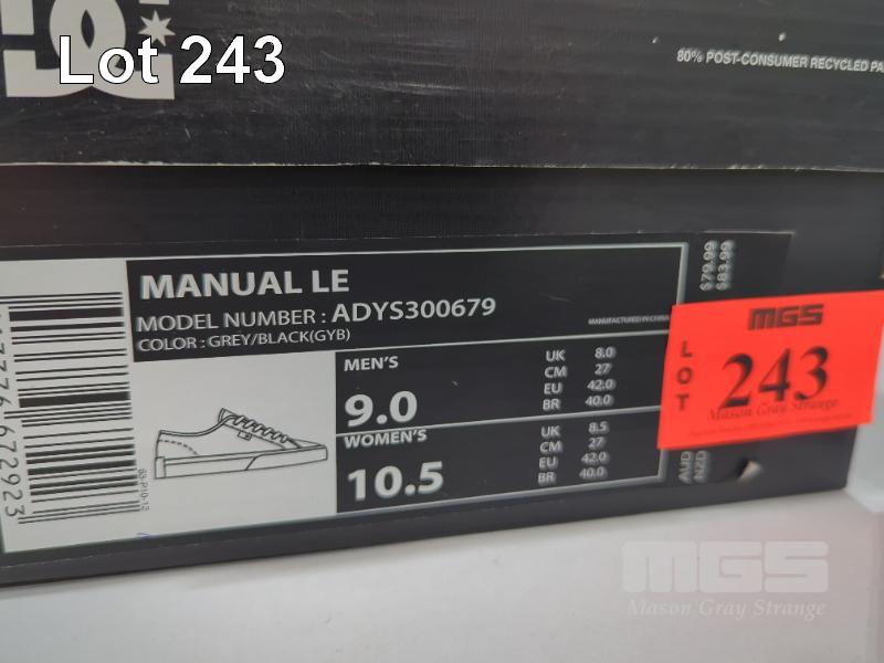 1 X PAIR DC SHOES "MANUAL LE" SHOES. MEN'S SIZE 9, WOMEN'S SIZE 10.5. COLOUR: GREY/BLACK.