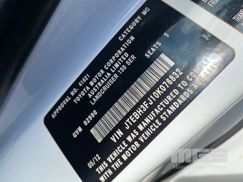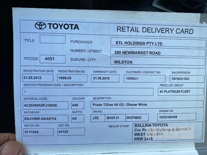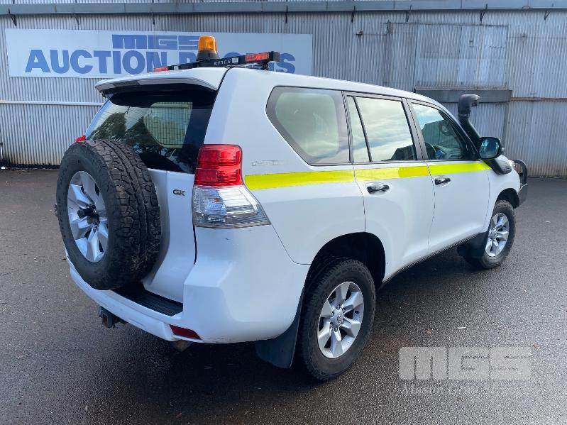 2012 TOYOTA LANDCRUISER, PRADO, GX, 150 SERIES, STATION WAGON, 4x4 ABS, AIR BAG, AIR CON, ALLOY WHEELS, BULL BAR, CD PLAYER, CENTRAL LOCKING, CRUISE CONTROL, IMMOBILISER, POWER STEERING, POWER WINDOWS, SPARE WHEEL, TRACTION CONTROL, WARNING LIGHTS, AIR INTAKE SNORKEL 6 POINT ROLL CAGE 2 WAY RADIO BATTERY ISOLATION SWITCH ROOF MOUNT WARNING LIGHT & INDICATOR BAR KEY #35 (NO PAPERS, WITH 2 KEY/S, NO OWNER'S MANUAL, NO SERVICE BOOKS)