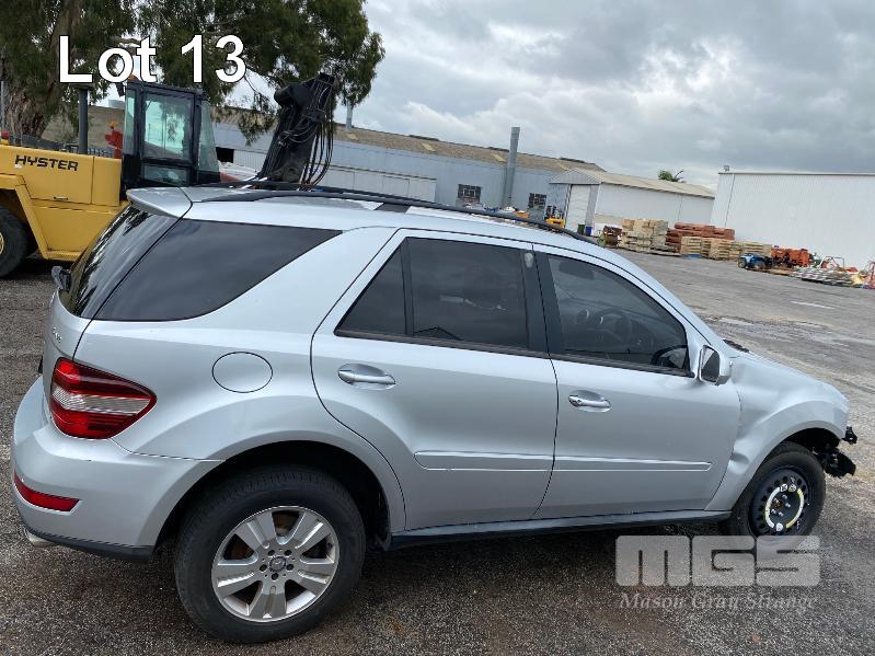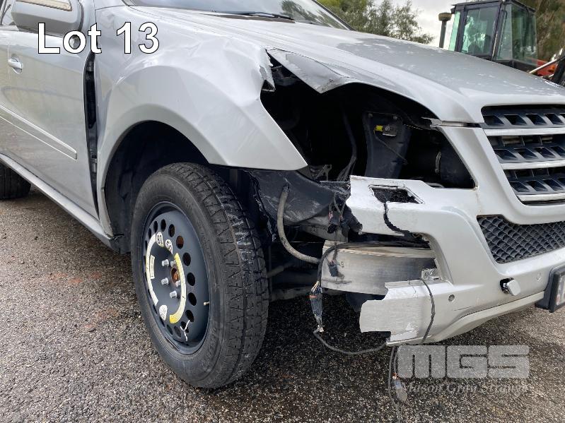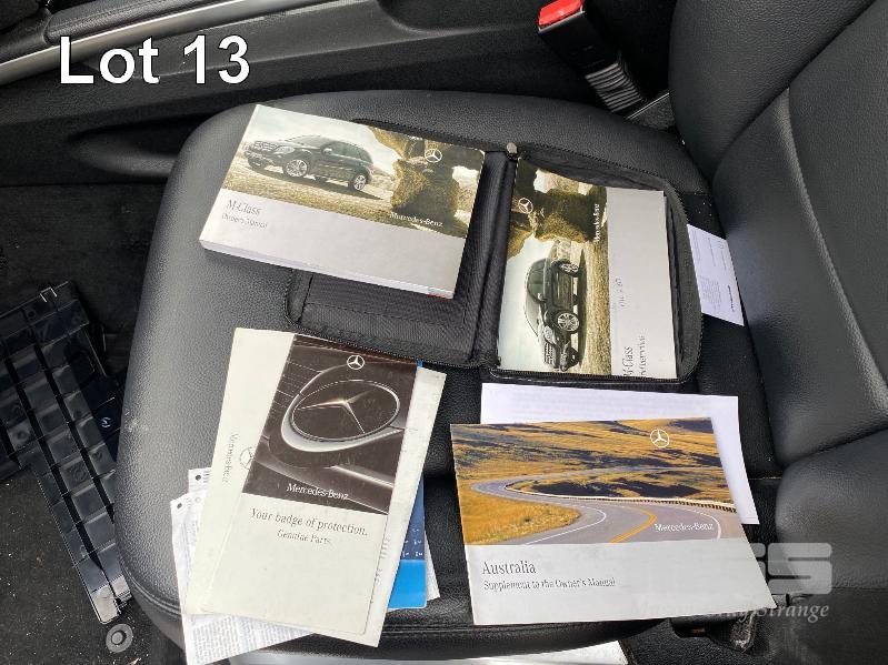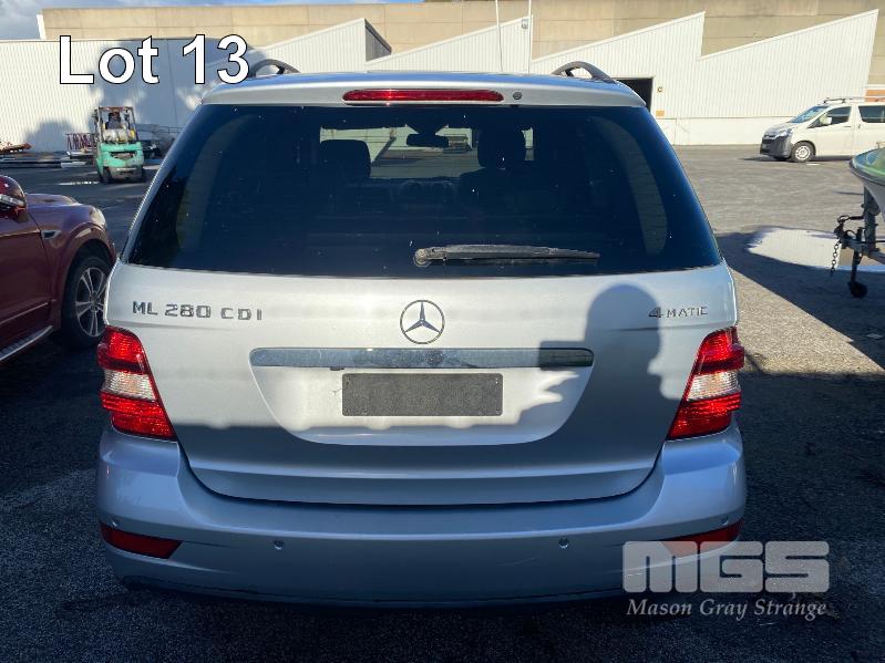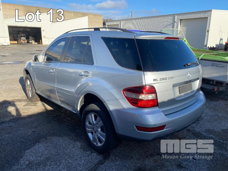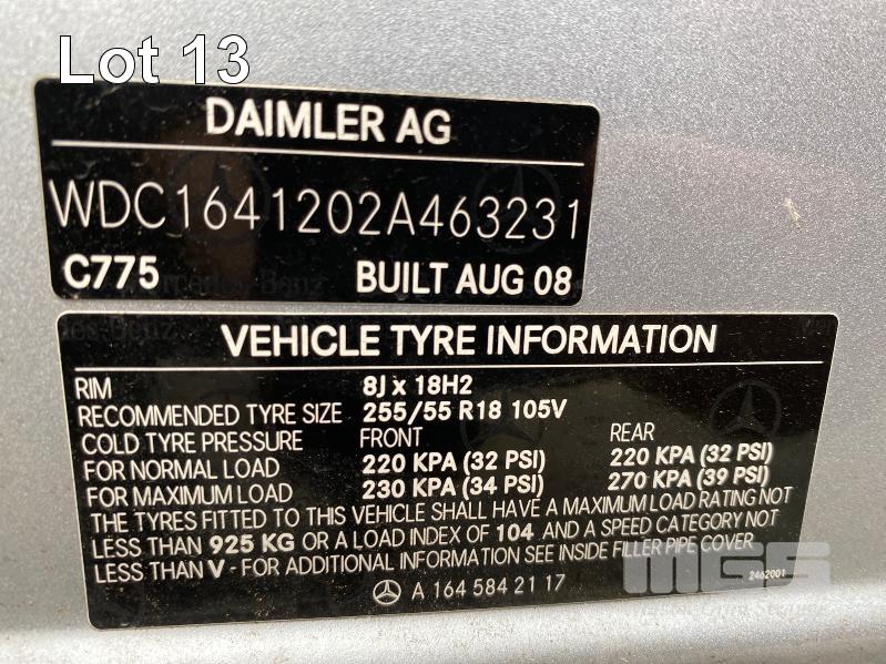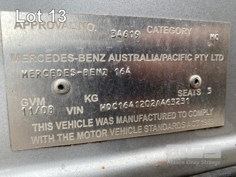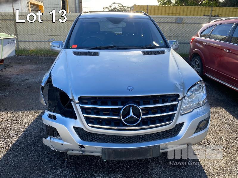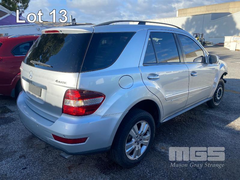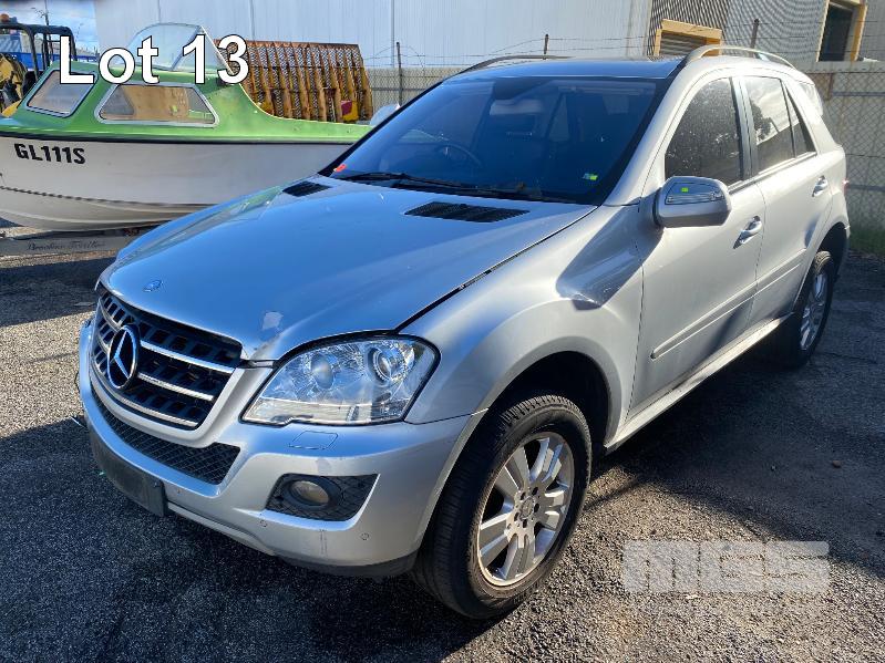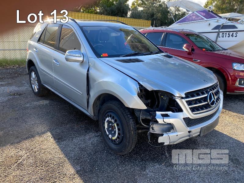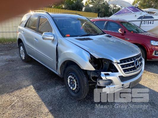 2008 MERCEDES BENZ ML280CDI 164 SUV 4x4 REG: NO PLATES VIN: WDC1641202A463231 V6 TURBO DIESEL, 7 SPEED AUTOMATIC TRANSMISSION, SILVER DUCO, 4 DOORS, 5 SEAT, 4x4 ABS, AIR BAG, AIR CON, ALLOY WHEELS, BLUETOOTH, CD PLAYER, CENTRAL LOCKING, CRUISE CONTROL, IMMOBILISER, LEATHER TRIM, POWER STEERING, POWER WINDOWS, ROOF RACKS, SPARE WHEEL, SUNROOF, TRACTION CONTROL, ENGINE STARTS & RUNS TRANSMISSION IS LOCKED OUT SOLD WITH NO REG OR PLATES VEHICLE IS NOT WRITTEN OFF KEY #25 (WITH 1 KEY/S, WITH OWNER'S MANUAL, WITH SERVICE BOOKS) CONDITION: FRONT RHS, IMPACT DAMAGE - TO GUARD, BUMPER, GRILL & BONNET - POSSIBLE CHASSIS DAMAGE