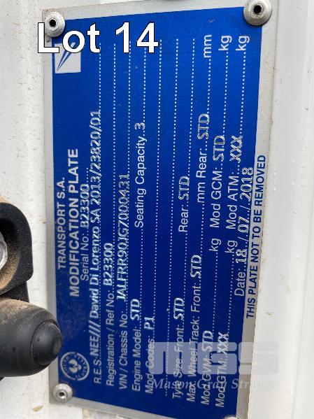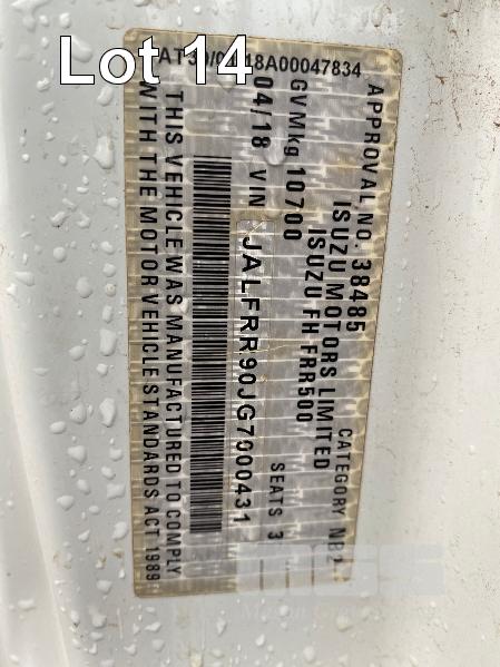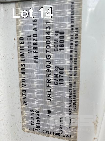 2018 ISUZU FH-FRR500 4x2 SINGLE CAB TIPPER REG: SB 67 NU (SA) VIN: JALFRR90JG700431 ODO: 75,295kms SHOWING GVM: 10,700kg GCM: 16,000kg 4 CYLINDER TURBO DIESEL, 6 SPEED MANUAL TRANSMISSION, SPRING SUSPENSION, WHITE DUCO, 2 DOORS, 3 SEAT, AIR CON, HYDRAULICS, TIPPER HOIST CONTROLS, TOW BALL HITCH REVERSING CAMERA SRS AIR BAGS 2 WAY TAILGATE & HINGED SIDES SPARE WHEEL BOOKS KEY #70 (WITH 1 KEY/S)