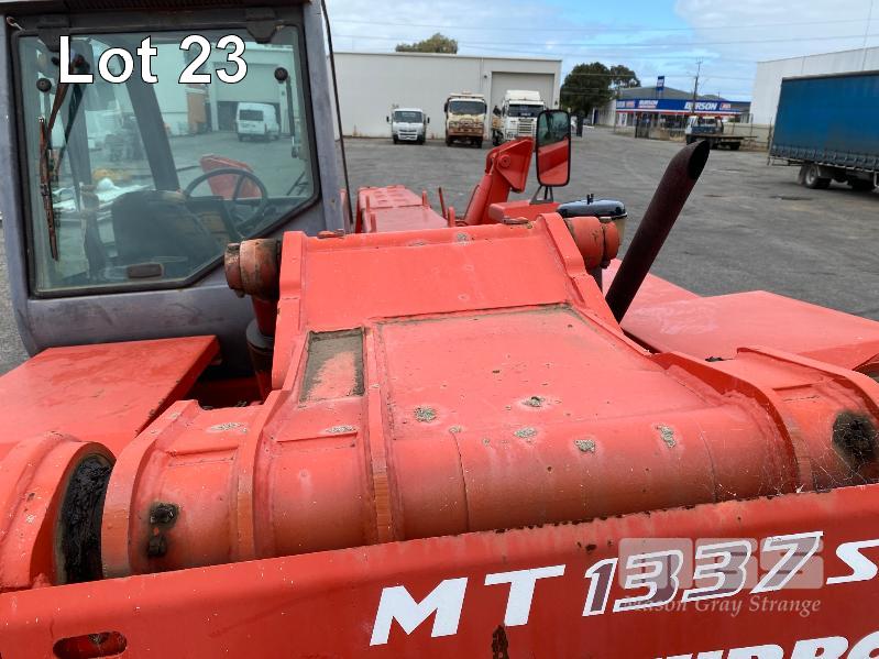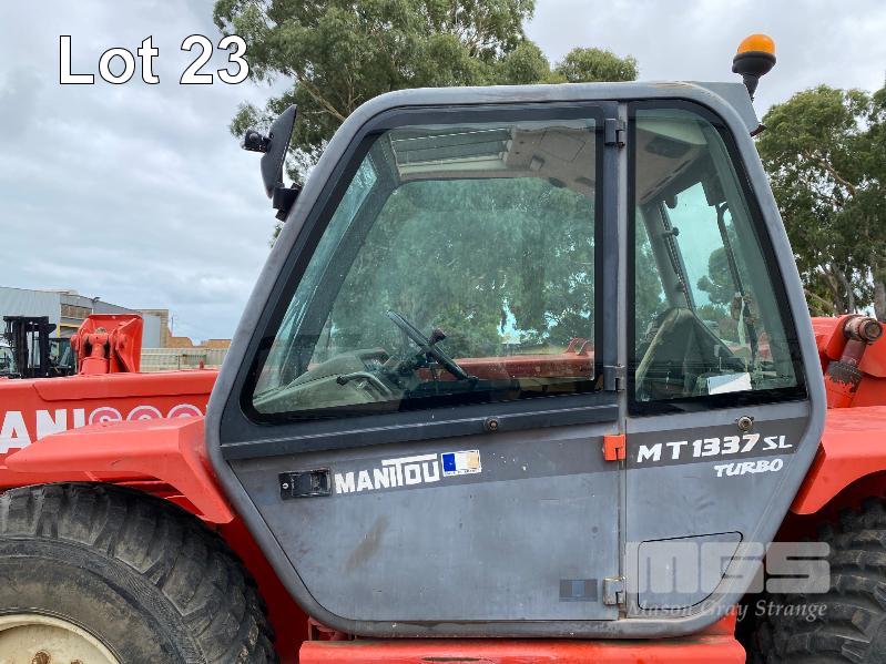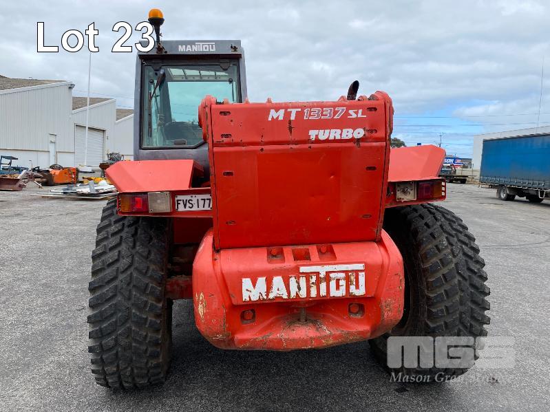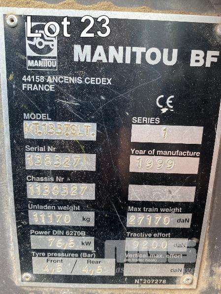 1999 MANITOU BF, MOD: MT.1337SLT, 4x4 TELEHANDLER REG: FVS 177 (SA) VIN: 138327 ENG: U012719D HOURS: 5,197hours SHOWING PERKINS 76Kw, 4 CYLINDER DIESEL TURBO, 4 SPEED S/NO: 138327 C/N: 1138327 MANISCOPIC BOOM WITH GP BUCKET & FORK ATTACHMENT 2 x OUTRIGGERS, ROPS/FOPS ENCLOSED CAB UNLADEN WEIGHT: 11,170kg WITH MANUALS & NON DESTRUCTIVE TEST REPORT KEY #42 (WITH PAPERS, NO OWNER'S MANUAL, NO SERVICE BOOKS)