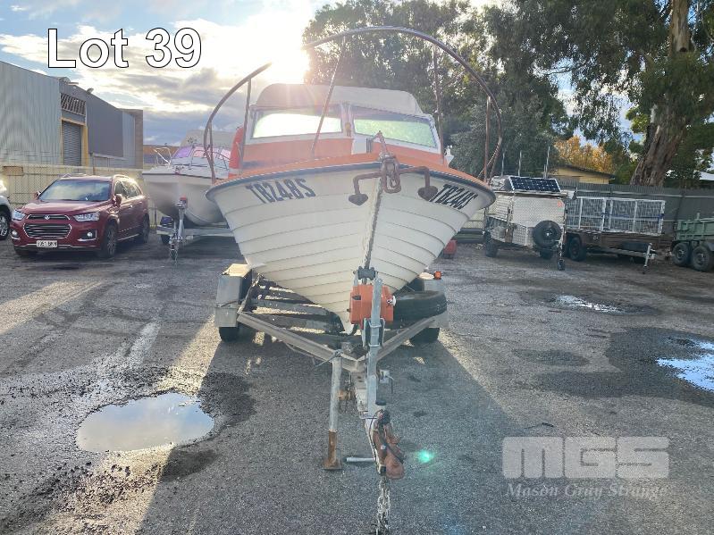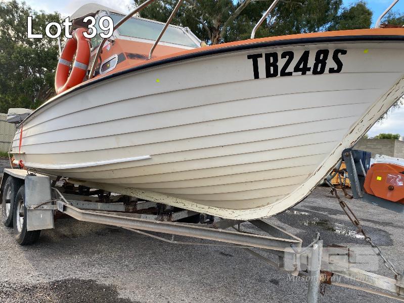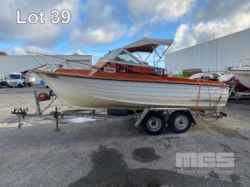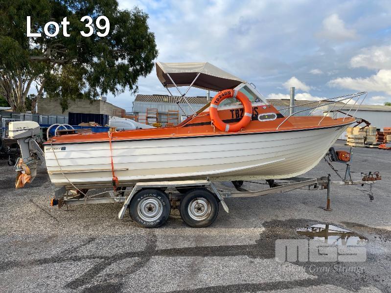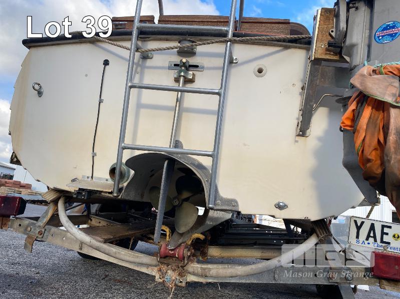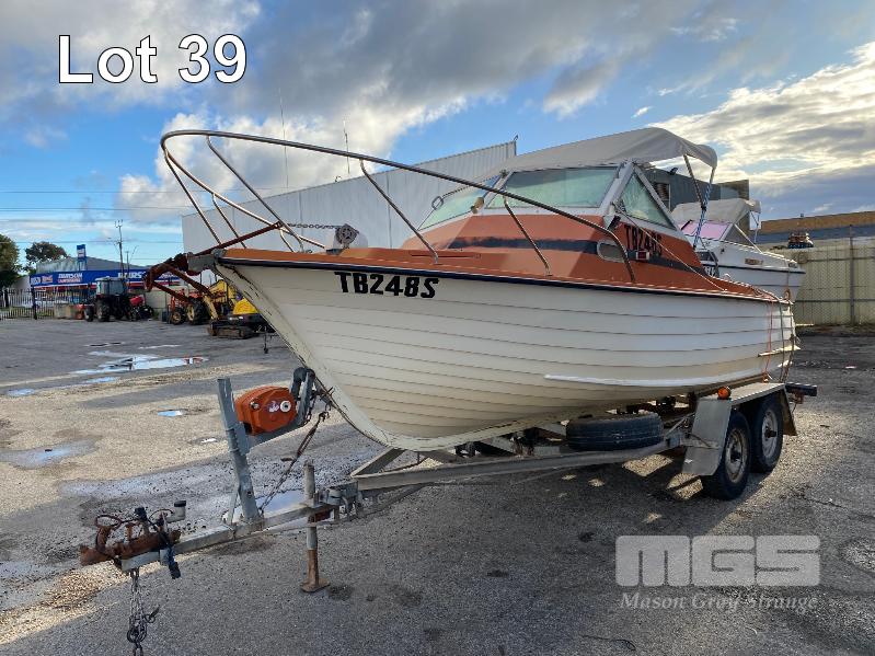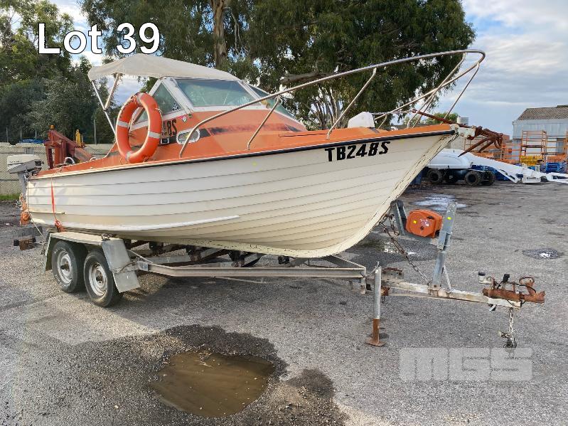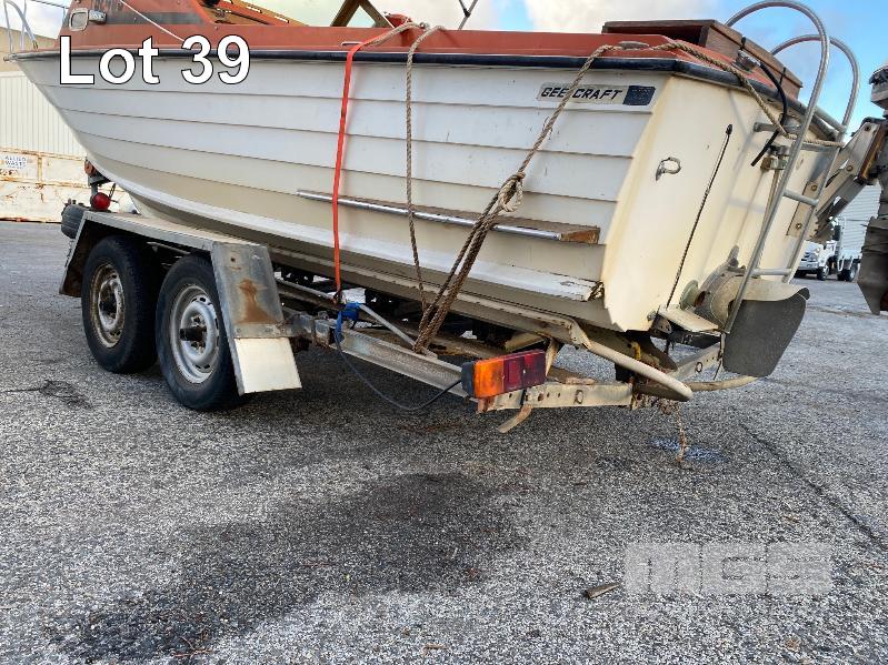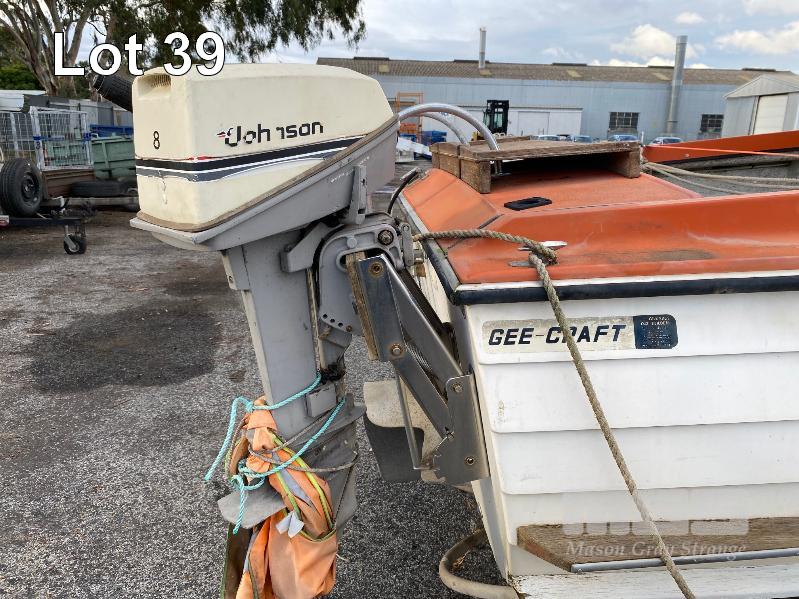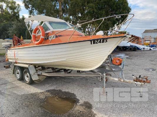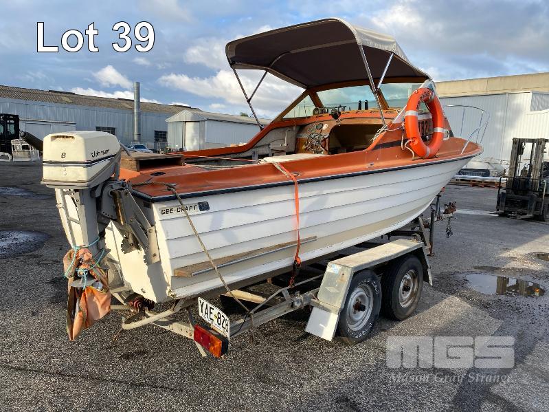 HALF CABIN FIBREGLASS BOAT, GEE CRAFT, 5.9m MARINE REG: TB248S HIN: AUTSA033641BX9 POWERED BY HOLDEN 186 ENGINE, IN BOARD WITH JOHNSON 8 OUTBOARD AUXILIARY WITH MARINE REG PAPER ON TANDEM AXLE TRAILER REG: YAE 828 DOM: 1985 GALV STEEL BALL HITCH, BRAKES' ELECTRIC WINCH WITH PAPERS