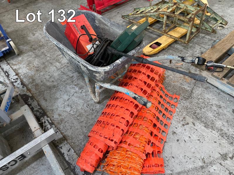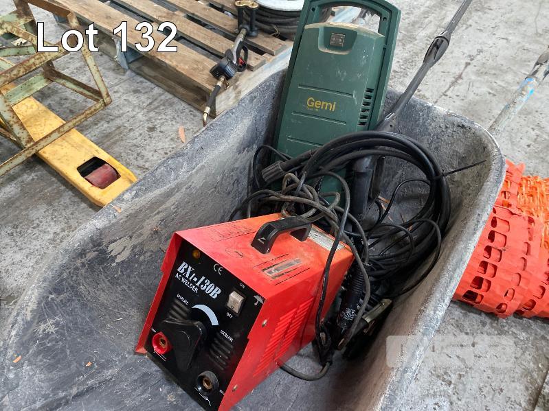 WHEELBARROW, ARC WELDER BX-130, 240V, GERNI PRESSURE WASHER, 240V & BUNTING