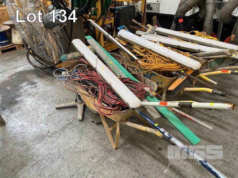 BUILDERS BARROW & SPIRIT LEVELS, 240V EXTENSION CORDS, SHOVELS, SCRAPERS, ETC