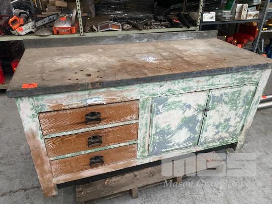 TIMBER WORK BENCH, SHEET METAL TOP, 3 DRAWER, 2 DOOR