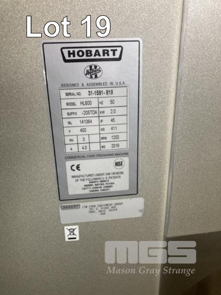PLANETARY MIXER, HOBART MOD: HL600 DOM: 2019 415V WITH HOOK & WHISK