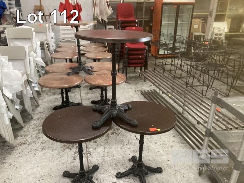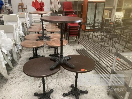 3 x CAFE TABLES, 60cm DIAMETER, MOULDED TOP, WROUGHT IRON BASE