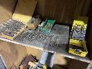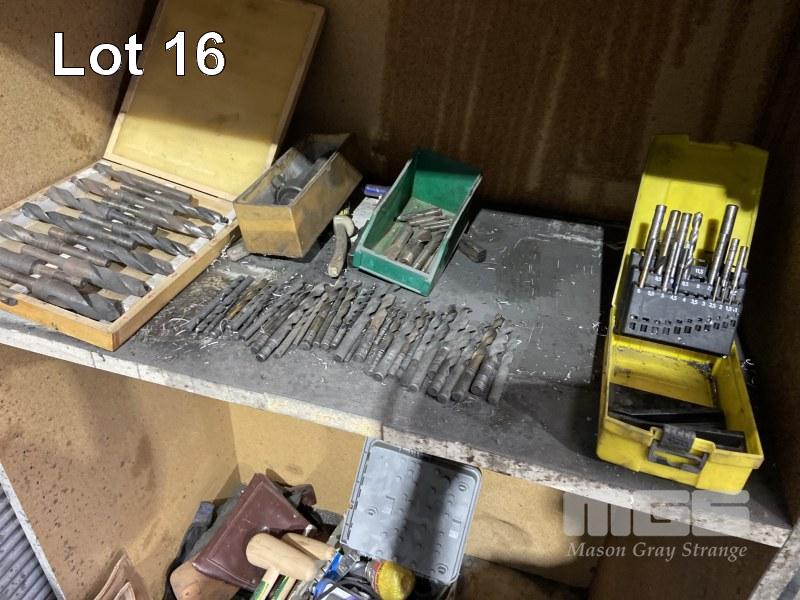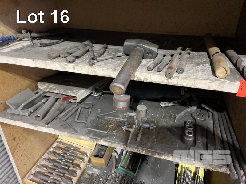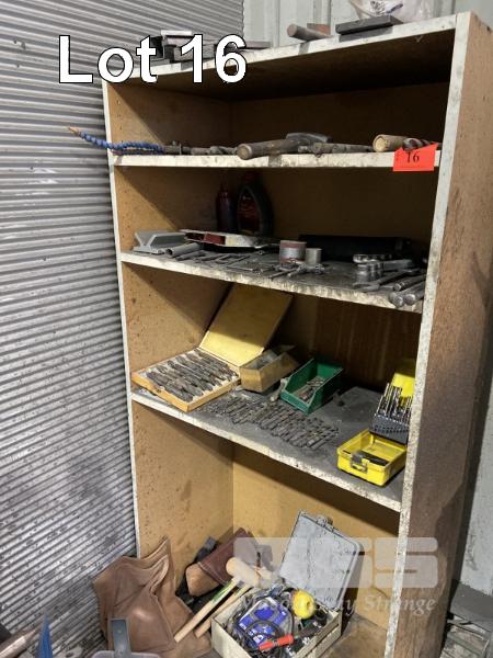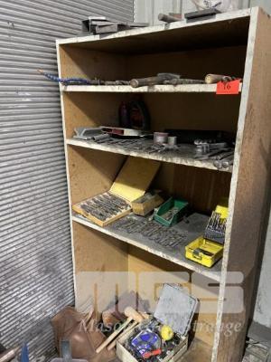 SHELF UNIT & CONTENTS, ASSORTED DRILL BITS, RIVET GUNS, TOOL BELT, KNEE PADS, HAMMER, LINISH TAPE, GREASE GUN, ASSORTED TOOLS & TOOL HOLDER ETC.