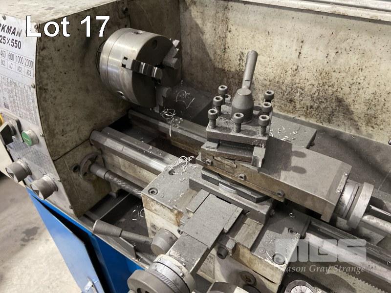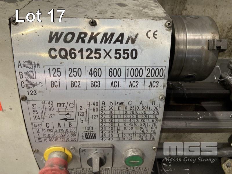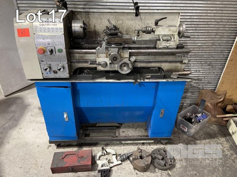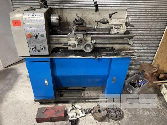 WORKMAN LATHE, MODEL: CQ6125X550, 240v, ON STAND, MOBILE, 3 JAW CHUCK, 4 JAW CHUCK, FACE PLATE, 2 x STEADYS, TOOL BOX & GEARS
