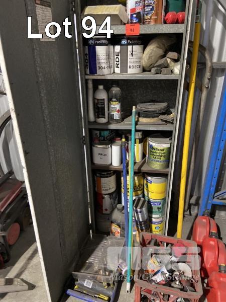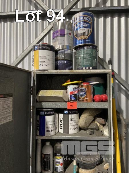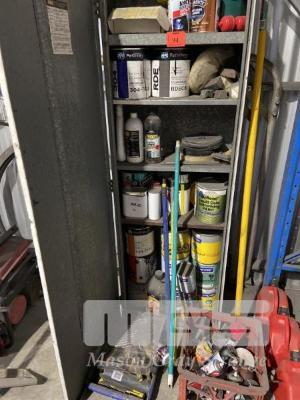 PAINT STORAGE CABINET & CONTENTS, VARIOUS PAINT THINNERS, WHITE SPIRITS, POLISH MATERIALS