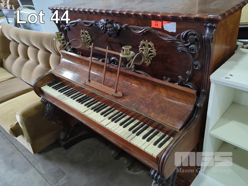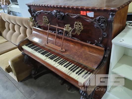 ANTIQUE UPRIGHT PIANO, BRAND UNSIGHTED, ORNATE WOOD CARVINGS, COMPLETE WITH PAIR BRASS SCONCES, EARLY TO MID 1800's BUILD