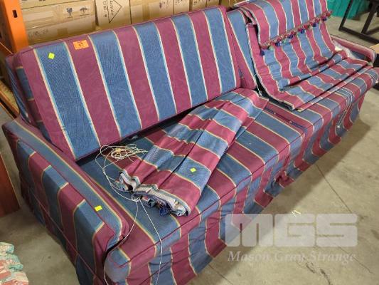 BLUE & BURGUNDY STRIPED FABRIC UPHOLSTERED SOFA WITH SCATTER CUSHIONS