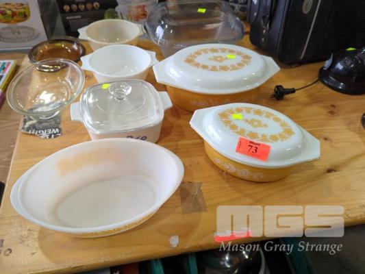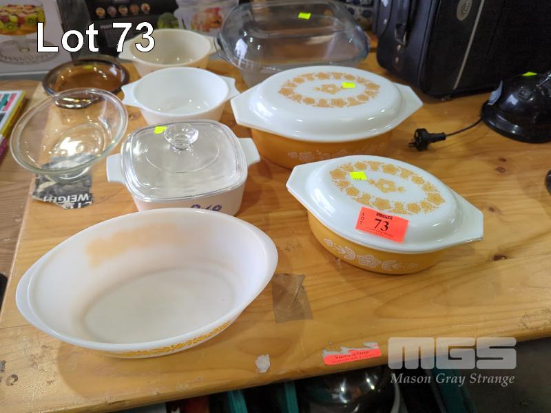 OVENWARE AND KITCHENWARE INCLUDING PYREX & CORNINGWARE. (PART TABLE AND 2 X PLASTIC TUBS NOT INCLUDED).