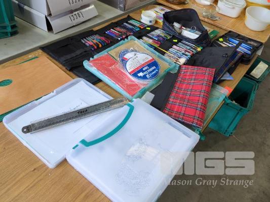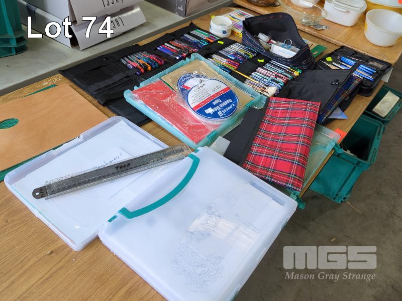 COLLECTION OF STATIONERY, PENCILS, OIL PASTELS, PENCIL CASES ETC. PART TABLE.