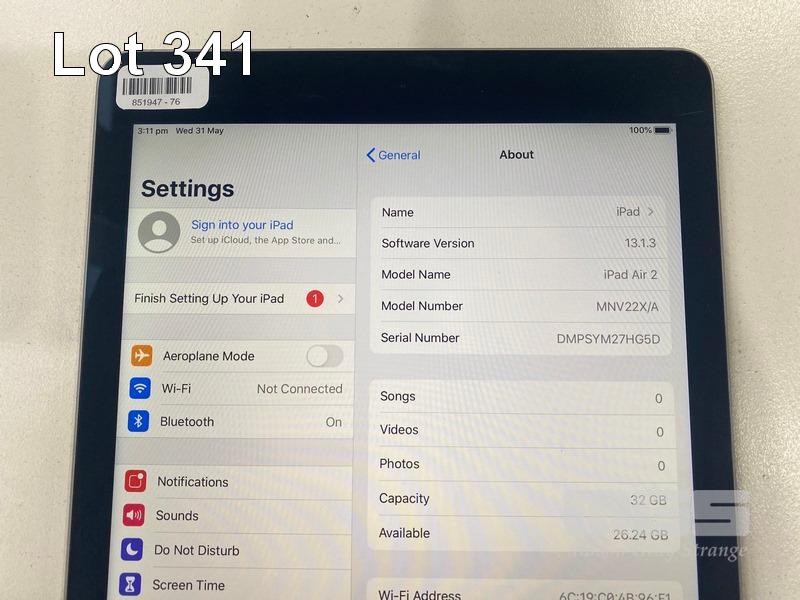 APPLE iPAD AIR 2, 32GB, Wi-Fi, SPACE GREY, MODEL A1566, MNV22X/A (NO CABLE, NO CHARGER) S/N:DMPSYM27HG5D