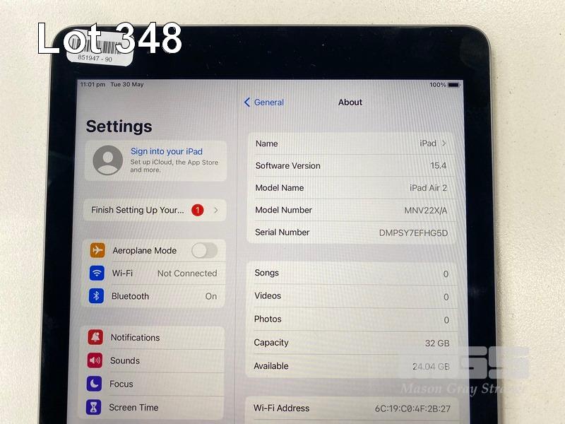 APPLE iPAD AIR 2, 32GB, Wi-Fi, SPACE GREY, MODEL A1566, MNV22X/A (NO CABLE, NO CHARGER) S/N:DMPSY7EFHG5D