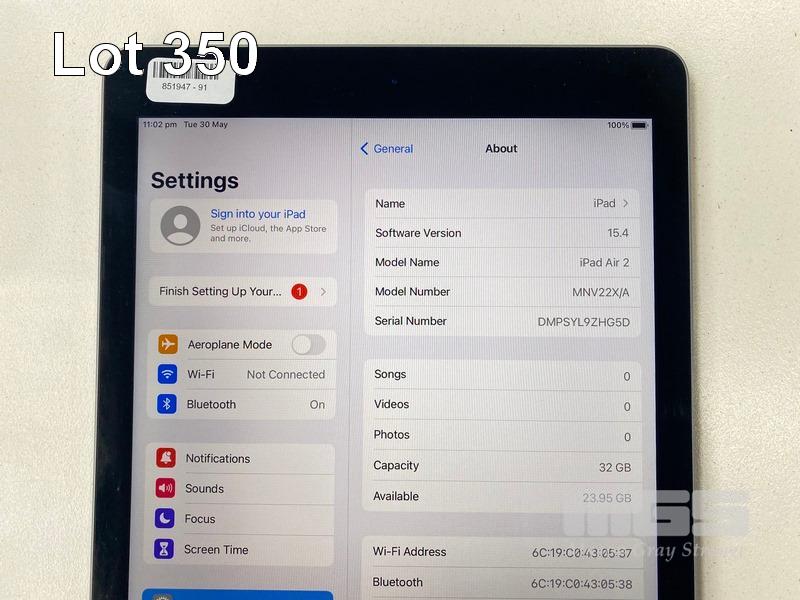 APPLE iPAD AIR 2, 32GB, Wi-Fi, SPACE GREY, MODEL A1566, MNV22X/A (NO CABLE, NO CHARGER) S/N:DMPSYL9ZHG5D