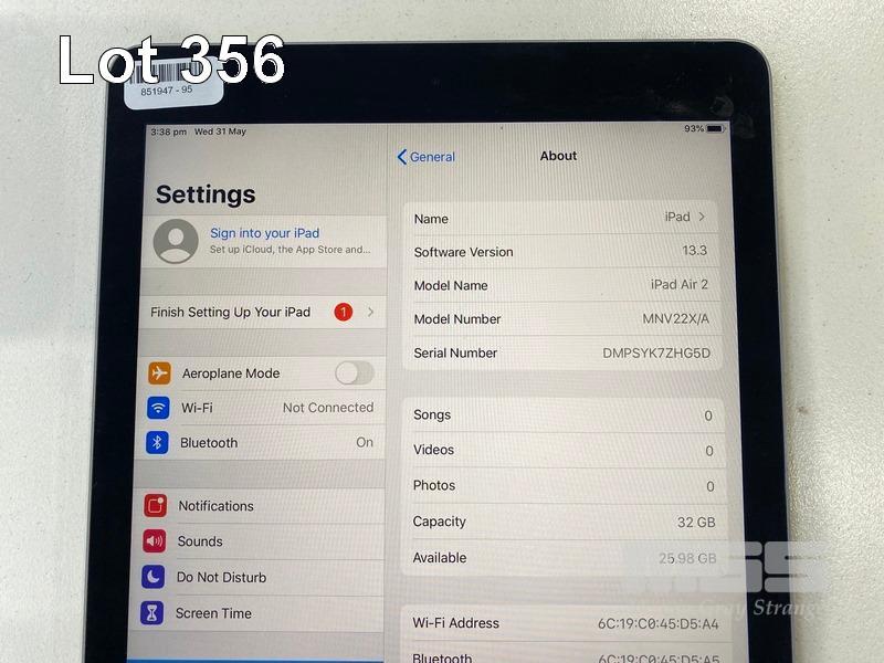 APPLE iPAD AIR 2, 32GB, Wi-Fi, SPACE GREY, MODEL A1566, MNV22X/A (NO CABLE, NO CHARGER) (NOTE: SMALL SCRATCH ON SCREEN) S/N:DMPSYK7ZHG5D