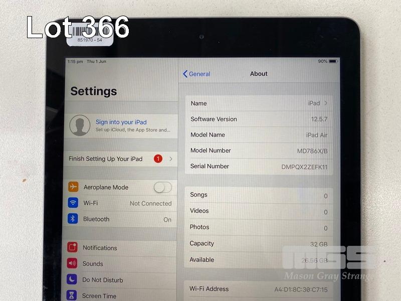 APPLE iPAD AIR, 32GB, Wi-Fi, SPACE GREY, MODEL A1474, MD786X/B (NO CABLE, NO CHARGER) S/N:DMPQX2ZEFK11