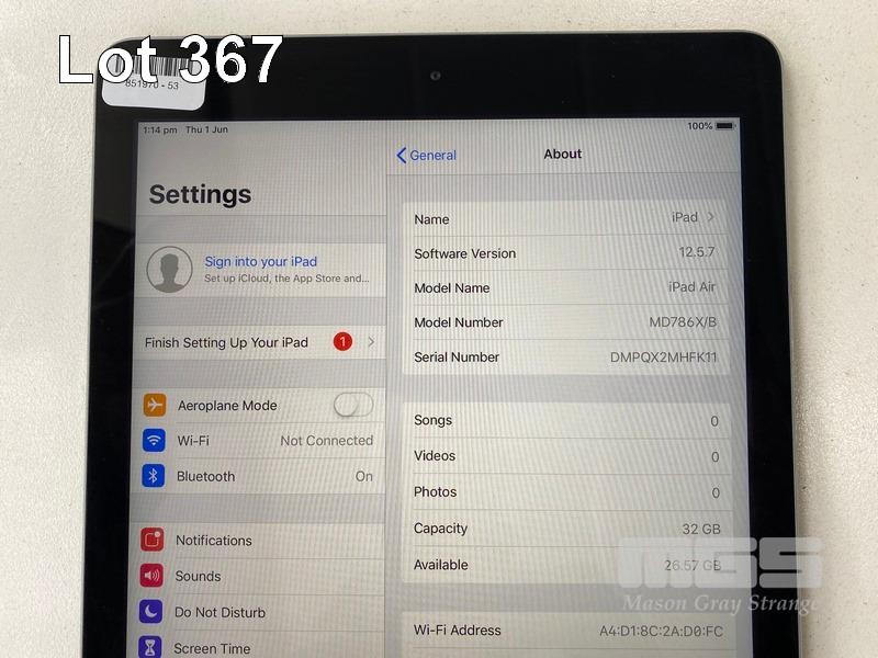 APPLE iPAD AIR, 32GB, Wi-Fi, SPACE GREY, MODEL A1474, MD786X/B (NO CABLE, NO CHARGER) S/N:DMPQX2MHFK11