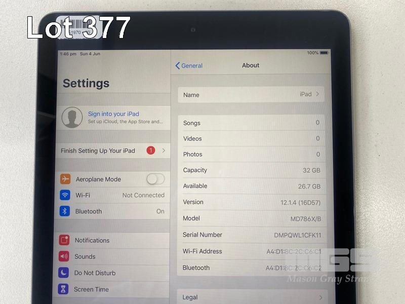 APPLE iPAD AIR, 32GB, Wi-Fi, SPACE GREY, MODEL A1474, MD786X/B (NO CABLE, NO CHARGER) S/N:DMPQWL1CFK11
