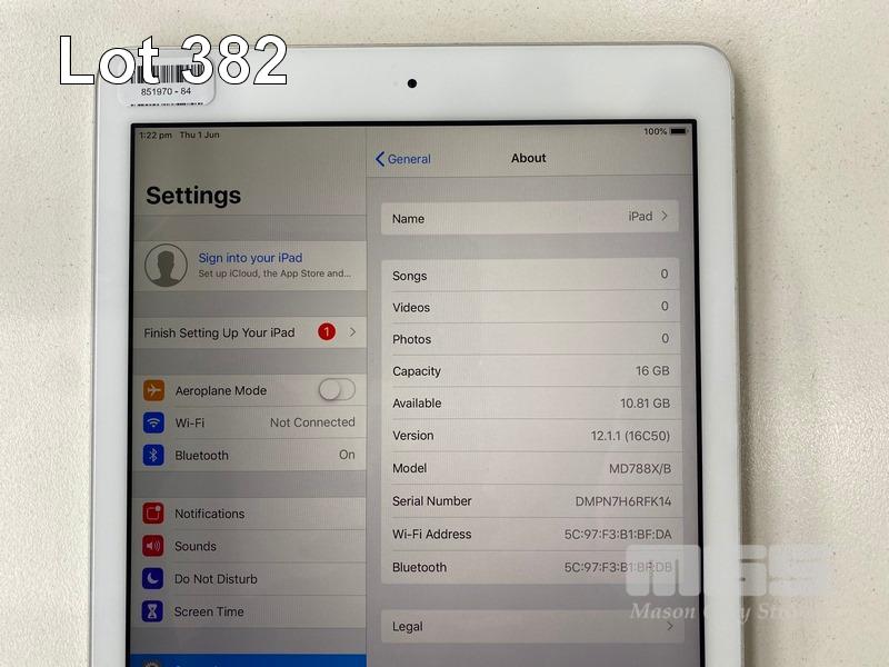 APPLE iPAD AIR, 16GB, Wi-Fi, SILVER, MODEL A1474, MD788X/B (NO CABLE, NO CHARGER) S/N:DMPN7H6RFK14