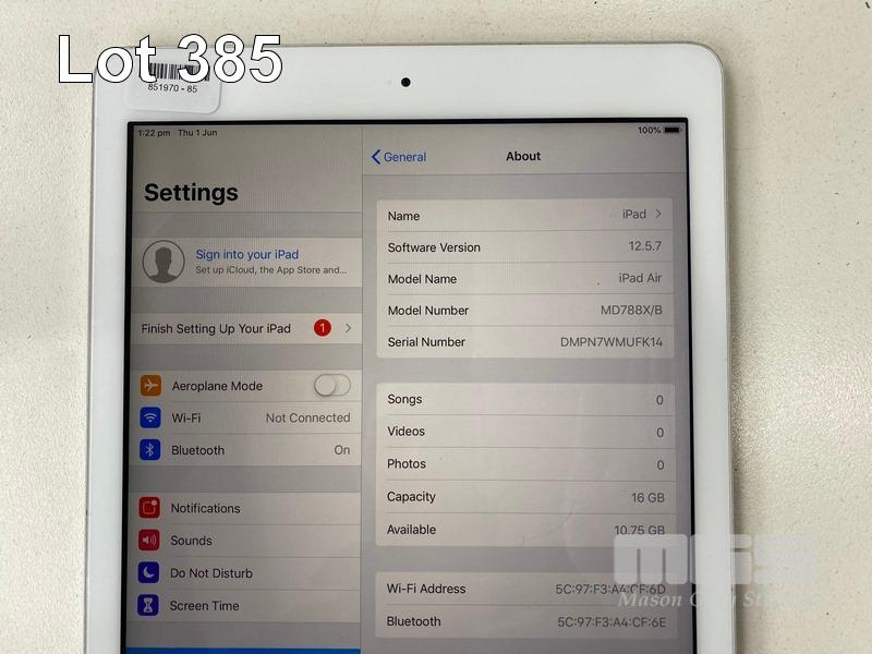 APPLE iPAD AIR, 16GB, Wi-Fi, SILVER, MODEL A1474, MD788X/B (NO CABLE, NO CHARGER) S/N:DMPN7WMUFK14