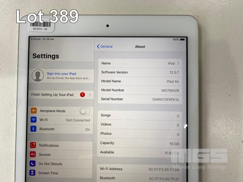 APPLE iPAD AIR, 16GB, Wi-Fi, SILVER, MODEL A1474, MD788X/B (NO CABLE, NO CHARGER) S/N:DMRNZ3FRFK14