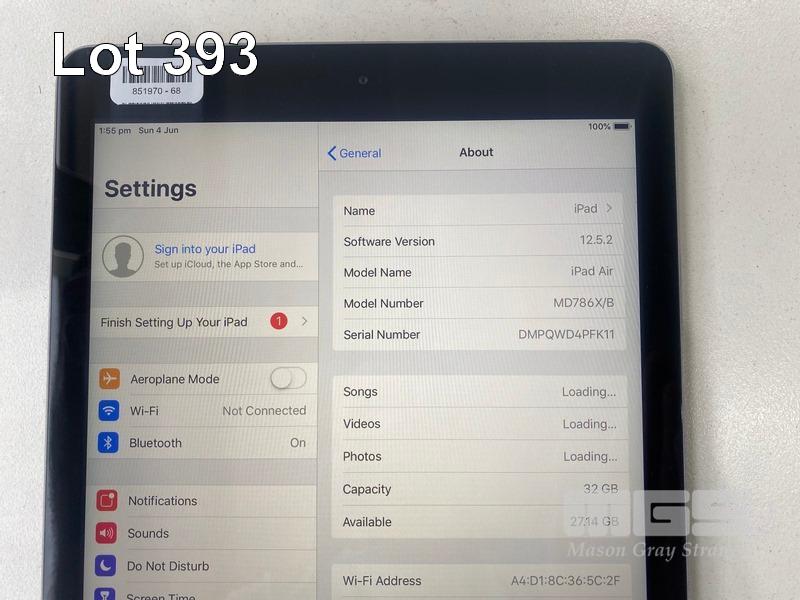 APPLE iPAD AIR, 32GB, Wi-Fi, SPACE GREY, MODEL A1474, MD786X/B (NO CABLE, NO CHARGER) S/N:DMPQWD4PFK11