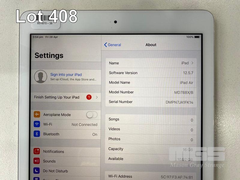 APPLE iPAD AIR, 16GB, Wi-Fi, SILVER, MODEL A1474, MD788X/B (NO CABLE, NO CHARGER) S/N:DMPN7JA1FK14