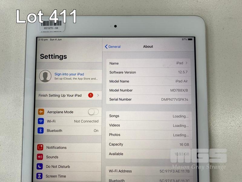 APPLE iPAD AIR, 16GB, Wi-Fi, SILVER, MODEL A1474, MD788X/B (NO CABLE, NO CHARGER) S/N:DMPN77VSFK14