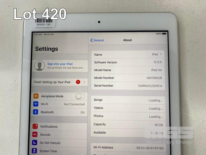 APPLE iPAD AIR, 16GB, Wi-Fi, SILVER, MODEL A1474, MD788X/B (NO CABLE, NO CHARGER) S/N:DMRN2VZGFK14