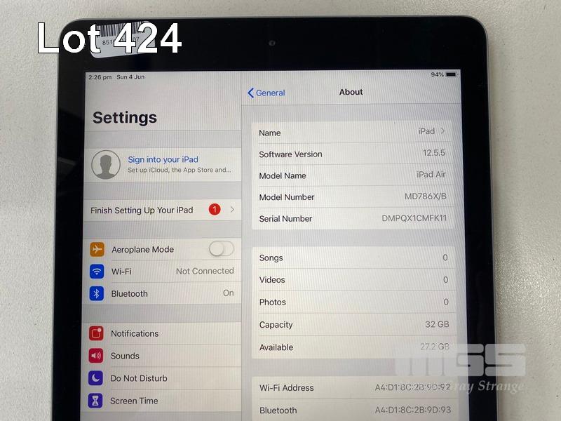 APPLE iPAD AIR, 32GB, Wi-Fi, SPACE GREY, MODEL A1474, MD786X/B (NO CABLE, NO CHARGER) S/N:DMPQX1CMFK11