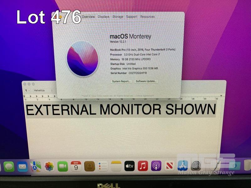 LAPTOP, APPLE MACBOOK PRO (A1706), CORE i7 6567U (6TH GEN) @ 3.3GHz, 16GB DDR3 RAM, 512GB SSD, 13.3" RETINA DISPLAY (2560x1600), INTEL IRIS GRAPHICS 550, THUNDERBOLT 3, TOUCHBAR, Wi-Fi, BLUETOOTH, MAC OS 12 INSTALLED (NO USB-C POWER SUPPLY) (NOTE: FAULTY, NO DISPLAY TO SCREEN, MINOR MARKS ON SCREEN) S/N:C02TF2GGHF1R