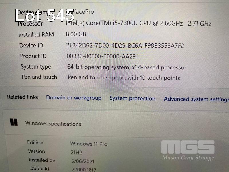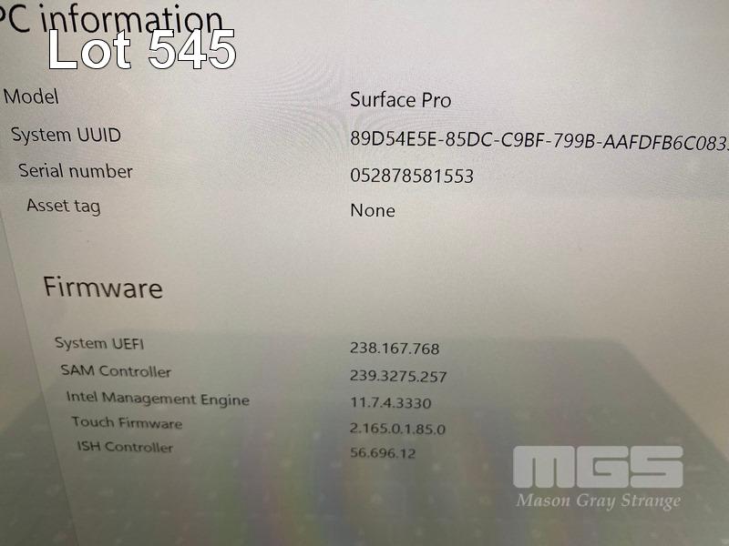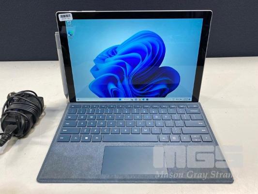 TABLET PC, MICROSOFT SURFACE PRO 5TH GEN, MODEL 1807, CORE i5 7300U (7TH GEN) @ 2.6GHz, 8GB RAM, 256GB SSD, 12.3" TOUCHSCREEN (2736x1824), INTEL HD GRAPHICS 620, Wi-Fi, CELLULAR, BLUETOOTH, WINDOWS 11 PRO INSTALLED, KEYBOARD TYPE COVER, STYLUS & POWER SUPPLY (NOTE: SMALL DENT IN CASING) S/N:052878581553